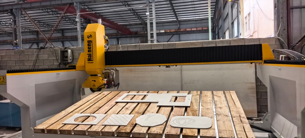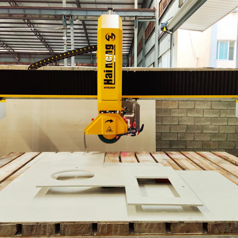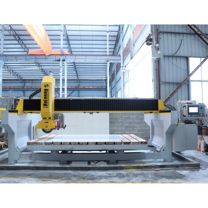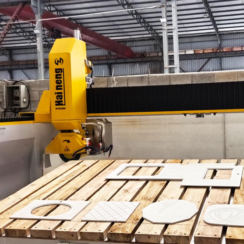 Haineng 4 Axis intelligent bridge cutting machine, equipped with an advanced CNC system, not only achieves high-speed, precise cutting of standard-sized panels but also effortlessly handles complex processes. Whether cutting polygons, trapezoids, rhombuses, or elegant ellipses, the equipment completes these tasks automatically. CNC bridge saw unique 45° automatic tool tilt function enables flawless four-sided chamfering in a single pass. Furthermore, surface grid-pattern effects can be easily achieved, meeting diverse decorative requirements.